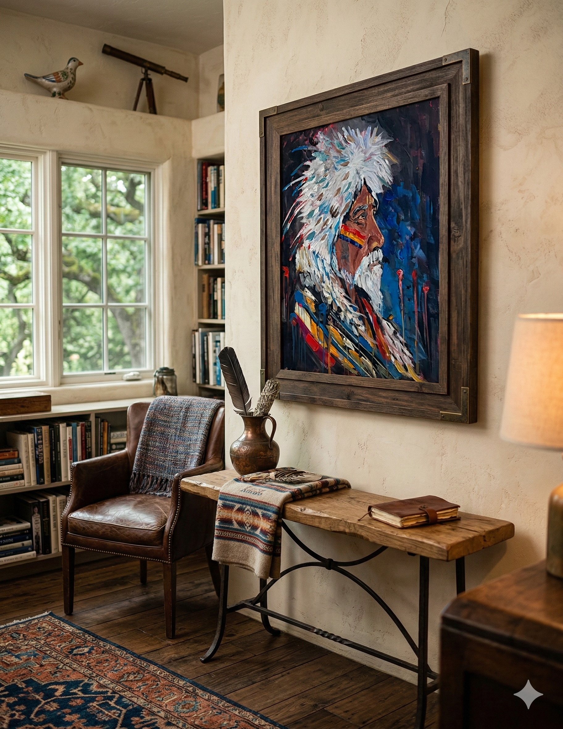Painted in acrylic on canvas, this striking profile portrait depicts a weathered elder adorned in a traditional white feather headdress, his face marked with ceremonial paint in bands of red, gold, and blue. His white beard and deeply lined features speak of a life fully lived — of stories carried across generations, of land known intimately, of a people who endure.