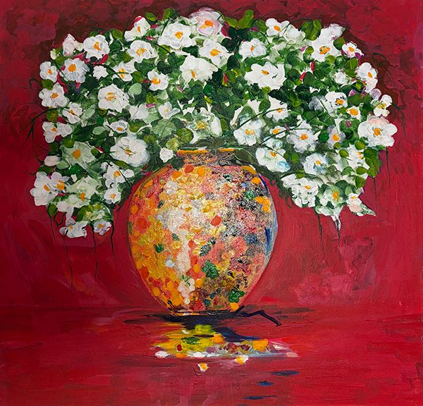The crimson background is the secret of this painting. Rich, deep and pulsing with energy, it pushes the white flowers forward and makes the multicoloured vase — dotted with orange, yellow, green and blue — glow like a jewel. The composition fills the entire canvas, edge to edge, leaving no room for anything but pure joy. The reflection pooling beneath the vase adds a quiet, grounding touch to an otherwise exuberant work.